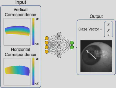 The deep learning-based deflectometric eye-tracking approach uses the “digital twin" of our Deflectometry setup to generate a training dataset simulating the deflectometric pattern reflection for different eye shapes at different locations and rotation angles. Instead of trying to render photorealistic intensity camera images under varying ambient lighting and screen illumination (which is difficult and leads to an “unrealistic" training dataset), we use the retrieved camera-screen correspondence maps as input to our model. The network learns the relation between input correspondence map and gaze direction. The simulated correspondence maps closely resemble the real captured correspondence maps which are used for gaze evaluation. Moreover, the use of “pure" correspondence maps prevents the network from learning secondary eye features (such as veins and wrinkles in the periocular region), which may not be present in real images.